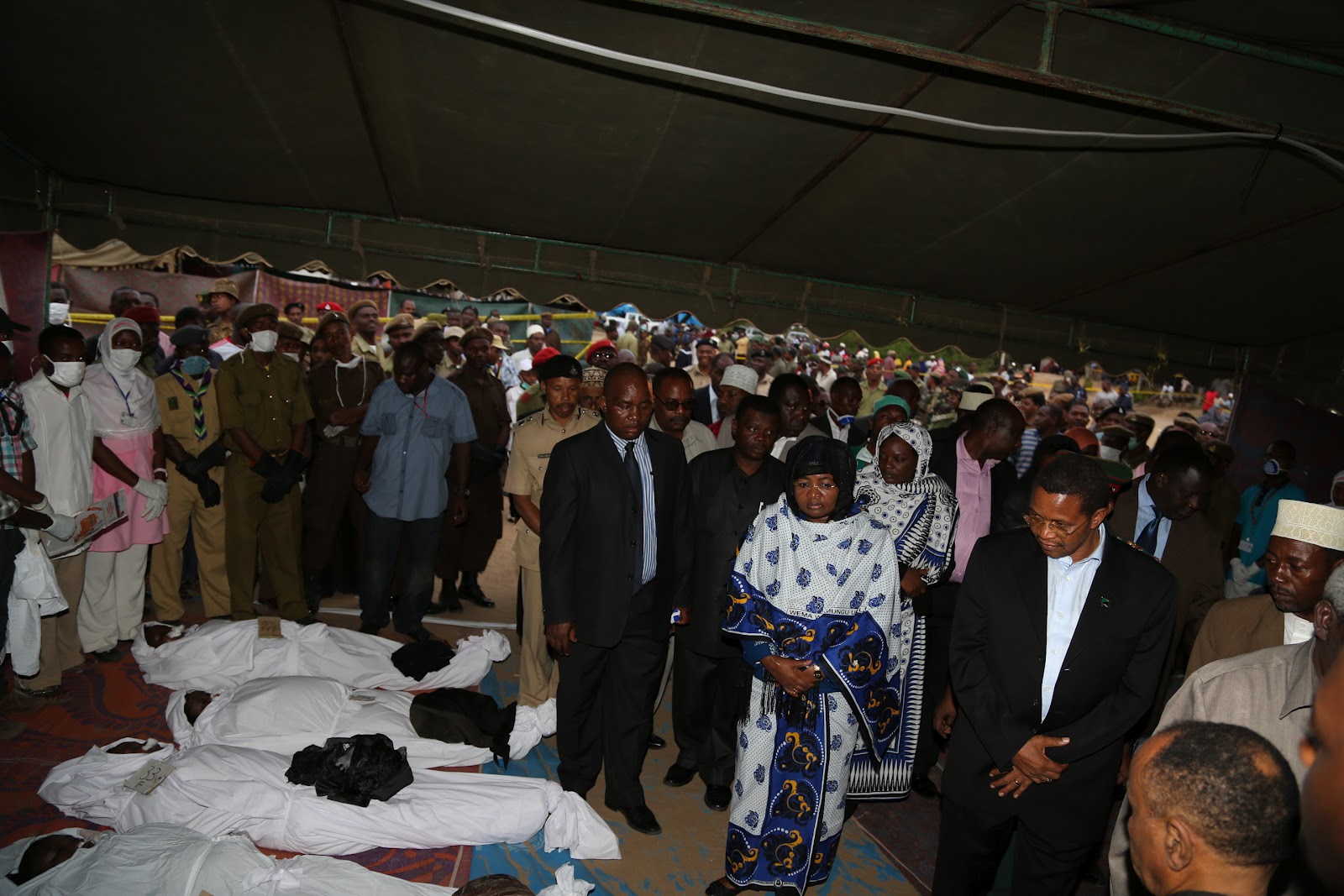 Rais Jakaya Mrisho Kikwete na Mama Salma Kikwete wakitembelea Uwanja wa Maisara, Zanzibar, ambako ndiko miili ya marehemu